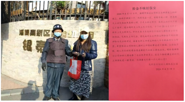 4月11日,市保安公司高新區(qū)銀泰城幼兒園項目部保安隊員王永上班路上撿到手提袋一個,四處找尋無果后,打開查看包內(nèi)有手機和少量現(xiàn)金,通過電話聯(lián)系找到失主,最終歸還遺失物品。失主家人拿到失而復得的財物后,十分激動并專門送上感謝信對其表示感謝。